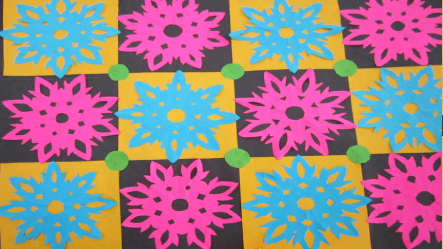 Penghasilan corak menggunakan teknik lipatan dan guntingan melibatkan proses di bawah kecuali.